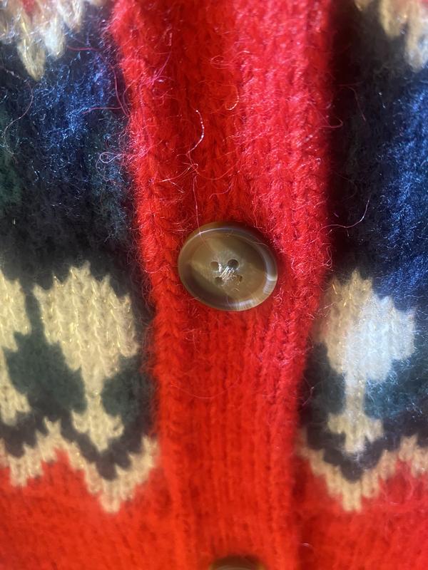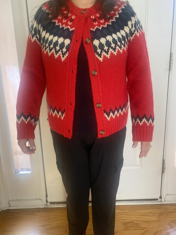 Love the Fair Isle pattern and the vibrant colors of Red, Green, Black, Cream, Navy Blue are so beautiful! Pretty buttons too. This sweater will keep you warm, so thick and soft, and the fit is just right. The cardigan makes it so easy to throw on and take off, easy to pack. Will go with any style. Made of Polyester, Acrylic and Nylon.