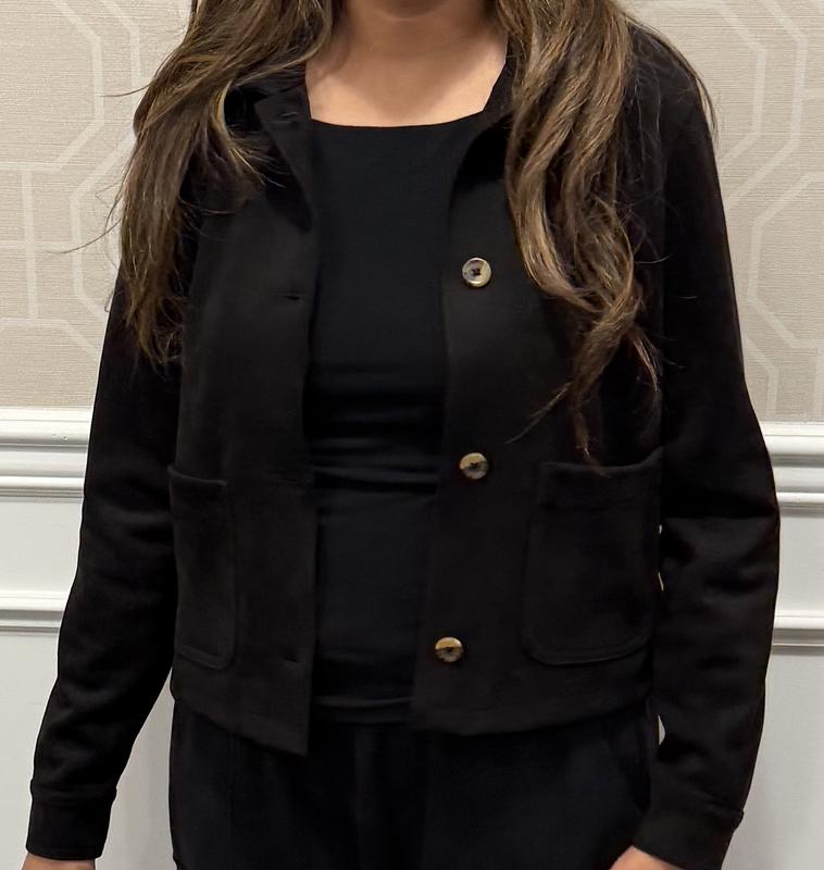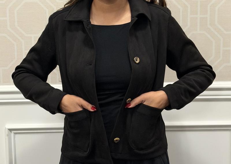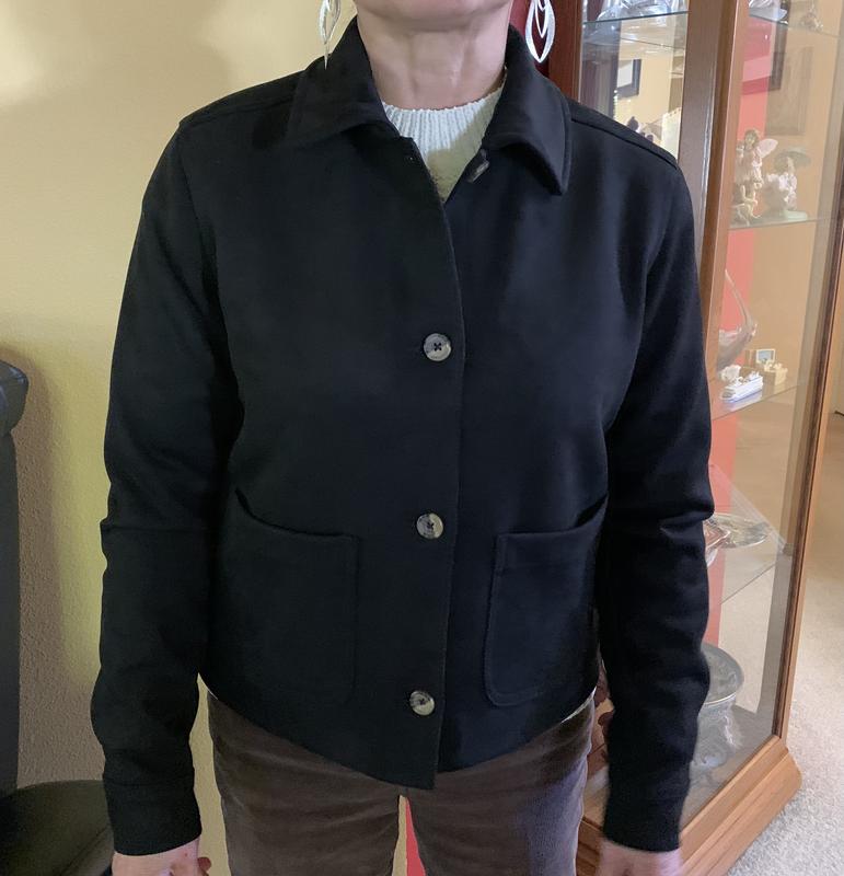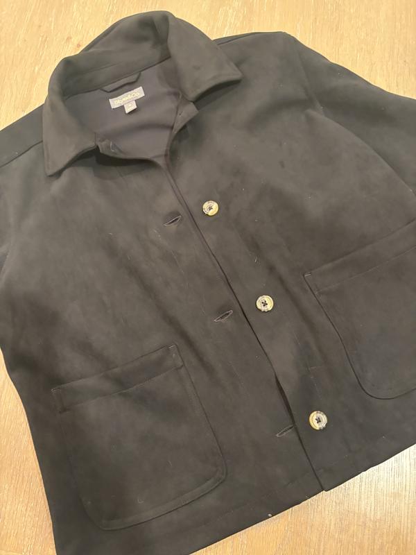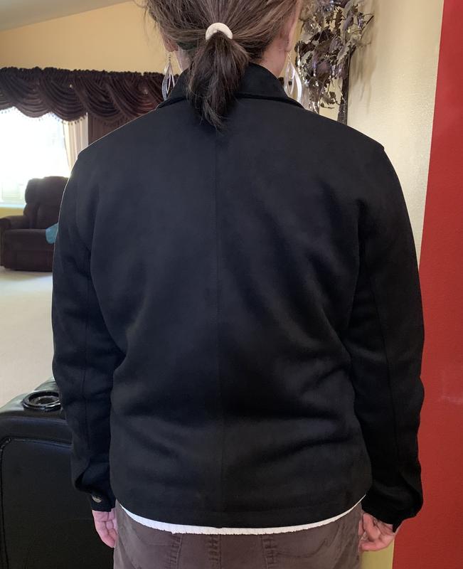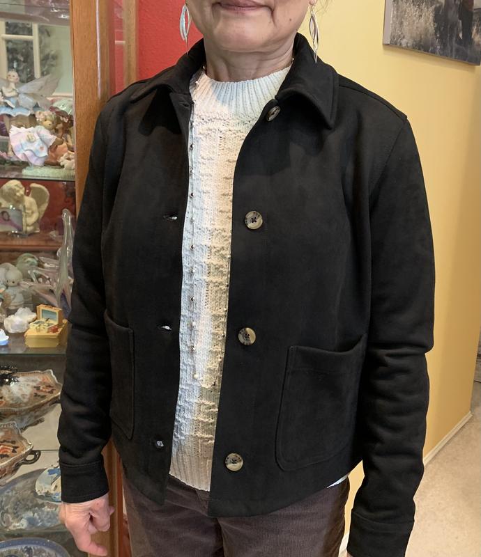 This faux suede jacket has a boxy fit the hits at the hips. I got the Small Petite size and I'm 125lbs, 36A. This lightweight jacket is fully lined and is ideal for cool temperatures and is roomy enough for layering. It has simple patch pockets in the front and is buttom up. Overall, I'm quite happy with this jacket.