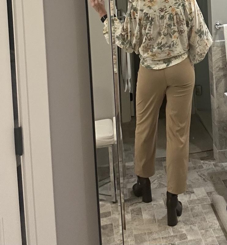 These pants seem to be of good quality. The material is soft and a tad bit stretchy. The color is a nice neutral. I like the slant pockets in front. Note the pockets in back are not real pockets, but I do like the look of the faux slit pockets in the back. Machine wash is nice. Dry flat. Now I am 5’4” 122 lbs, inseam 29 and I got the size 4, which is a typical size for me in other brands. I could barely get these pants on and struggled to zip them up. So I would say they run small. Size up. The length hit me right at the ankle. Took off 1 star for the miss on fit.