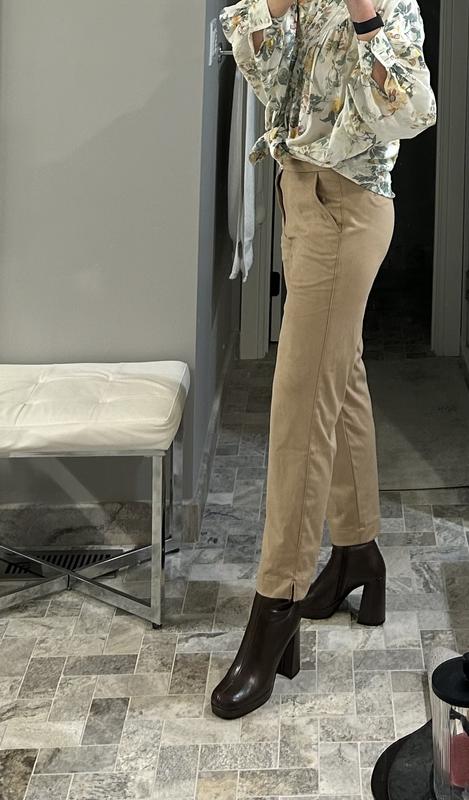The Style & Co woman's faux-suede pants have a very long rise that creates an awkward fit and appearance. Adding to this unattractive look is the weird length and that the pants don't look at all like suede, let alone real suede. I found the pants very unflattering and I would not recommend.