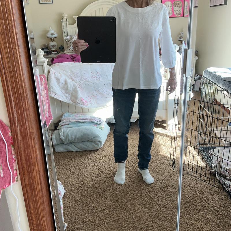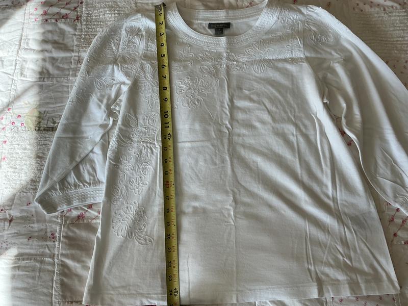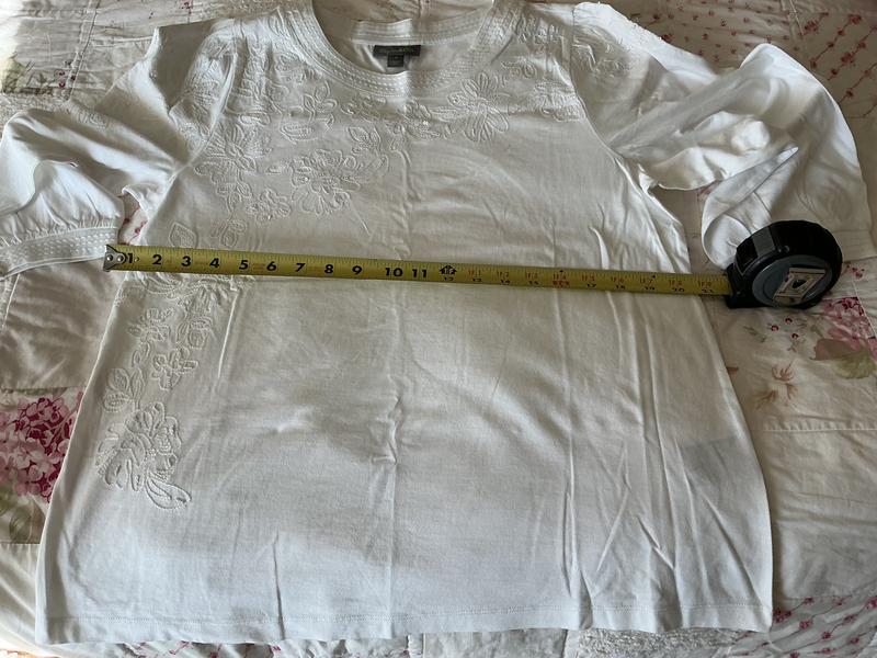 I have to say I really do like this shirt! It is super soft and has a great fit. I got the white shirt in a medium. I am 5’7” tall and it is the perfect fit for my body type. The collar is great as it is not a boat neck so bra straps aren’t showing all the time. The embroidery is pretty and adds an extra touch to the shirt and can be dressed up or down. The width is 20 1/2” at the bust and is 25” in length from shoulder to bottom. I do recommend this shirt as I feel it is very well made and very comfortable.