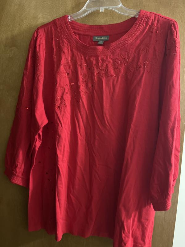 This is a cute very casual shirt! Can be worn with jeans and maybe a casual skirt! I also think it’s more suited for mid age to older woman! The quality of this shirt is not the quality I’m use to from Style & Co…not sure how many washes it will last thru!