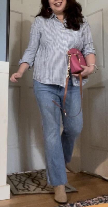 I purchased the striped version of this. Light fabric but not see through. Nice for casual look when you want to be dressed slightly more than casual. Could certainly wear to the office.