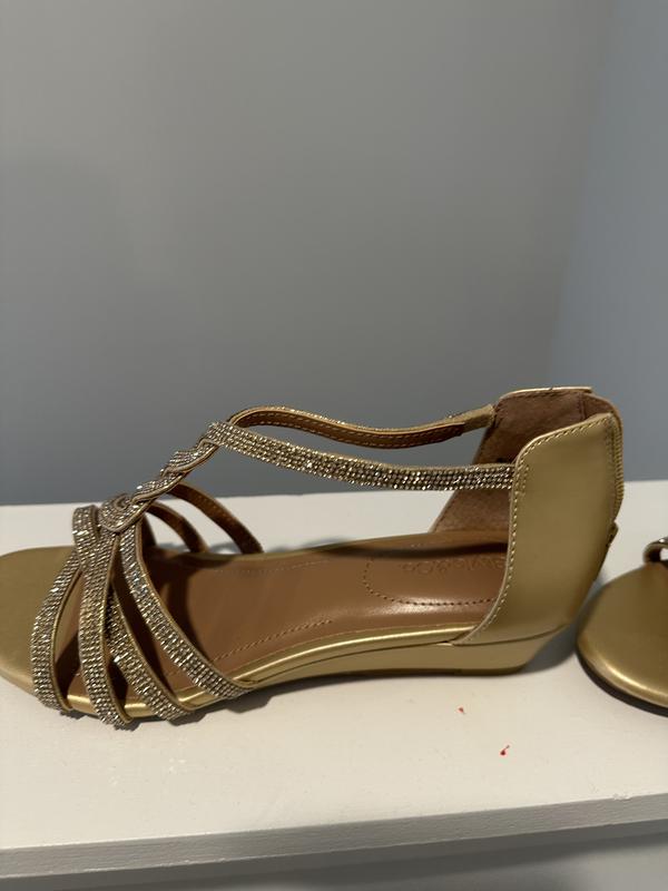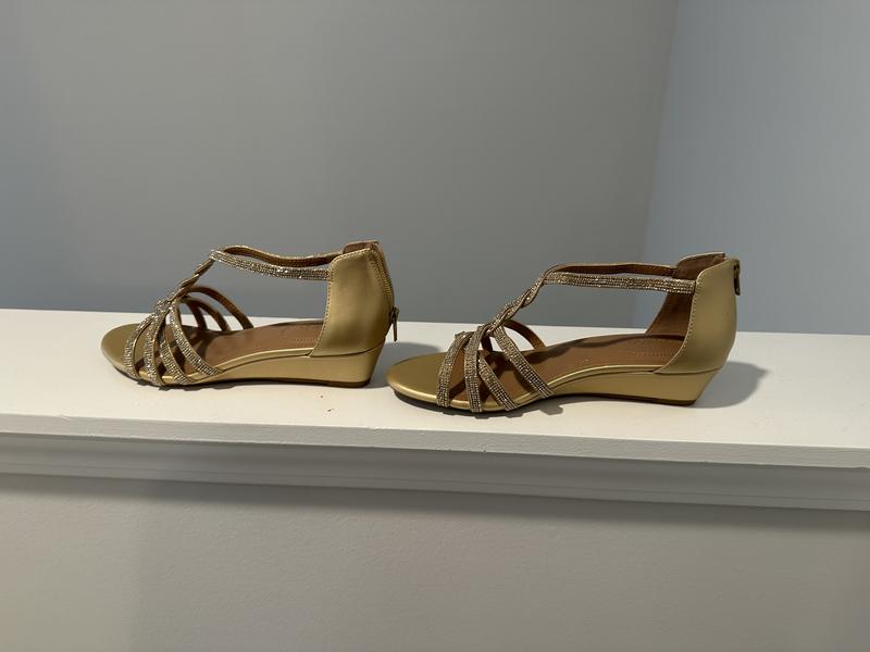 Cute but runs a bit small. Short wedge heel adds to comfort of this blingy sandal. Great for special occasions like prom or HOCO. Runs a little small but elastic and stretchy straps make it a great fit.