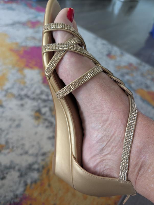 Even though these shoes are more of a wedge, they are dressy enough to go to a black tie wedding. The sparkling straps make a beautiful statement, a very tasteful design yet supporting your feet at the same time!!!!