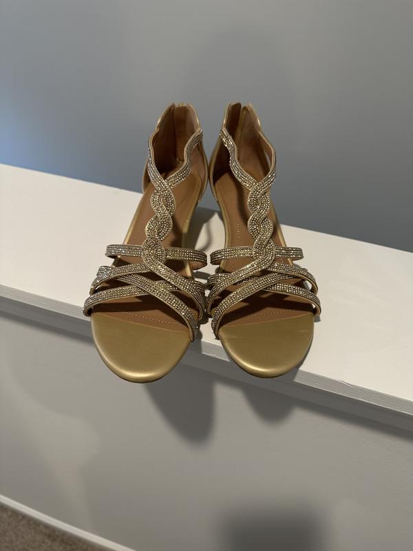 I'm always searching for shoes that are both stylish and comfortable, and these shoes fit the bill! The gold and sparkles make this the perfect shoe to pair with a night out event. They can also be the touch of glam to a casual outfit. Think "sandal," but make it elevated. Can pair perfectly with a skirt, dress or pants. Easy to wear, and no part of the shoe digs into the skin. Low profile heel so easy to walk in. Already packed for my next warm weather cruise!