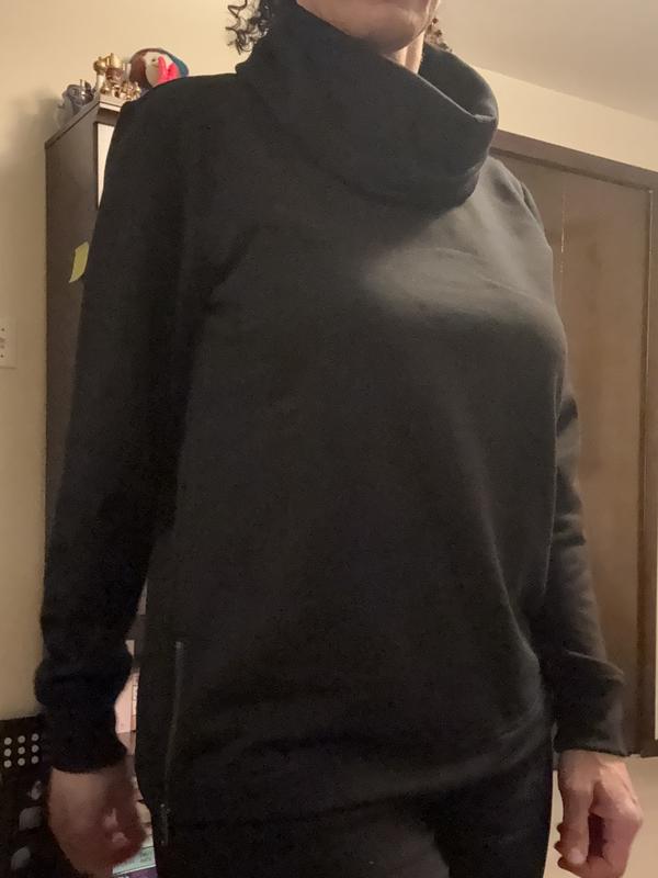 I like the cowl neck. It’s very soft inside… flannel like material. The zippers on the side are unnecessary but cute. The shoulders seem off but maybe I should have gotten a medium and not a large. Though a medium would have been snug. Cute top but doesn’t seem to fit right.