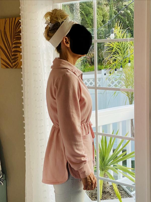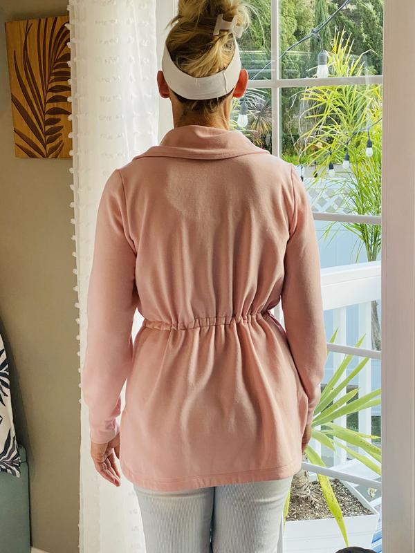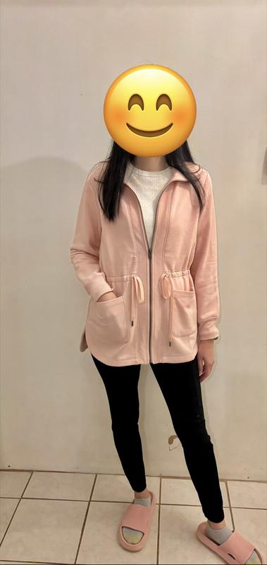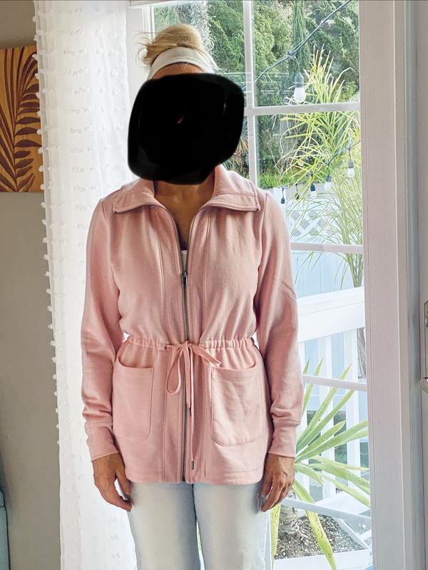 Love this beautiful jacket, it’s soft and comfortable to wear. The pink color is perfect for spring. You can do layers under this light jacket, and match it with jeans. It’s stylish, causal, and laid back. You can adjust your waistline with the drawstring. I am 5’6”, 130 pounds. Size S fits well on me.