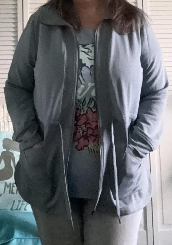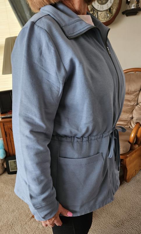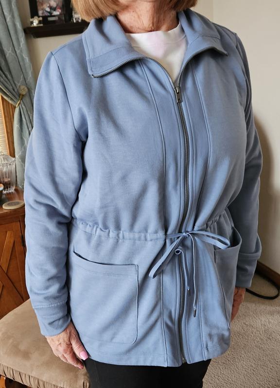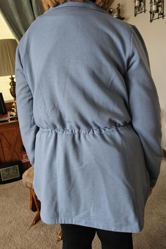 Love this warm, yet light jacket. I liked the string to cinch the waistline in and the longer length in the back. Well made, great for casual or even dress it up. Color is lovely and fabric is soft and washes well. Fit is true to size.