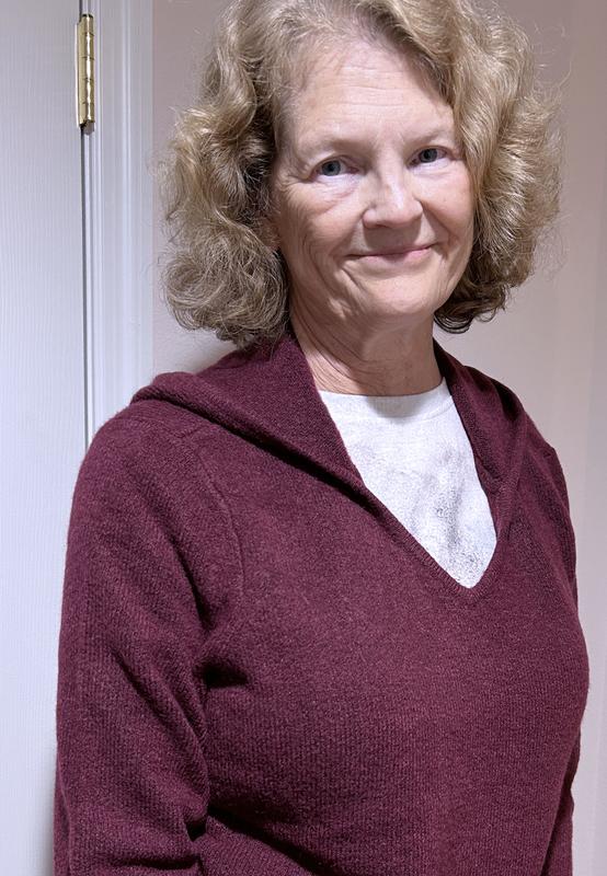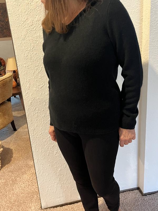 This sweater is beautiful. It fits beautifully and feels like real cashmere but not at cashmere price.