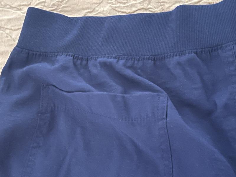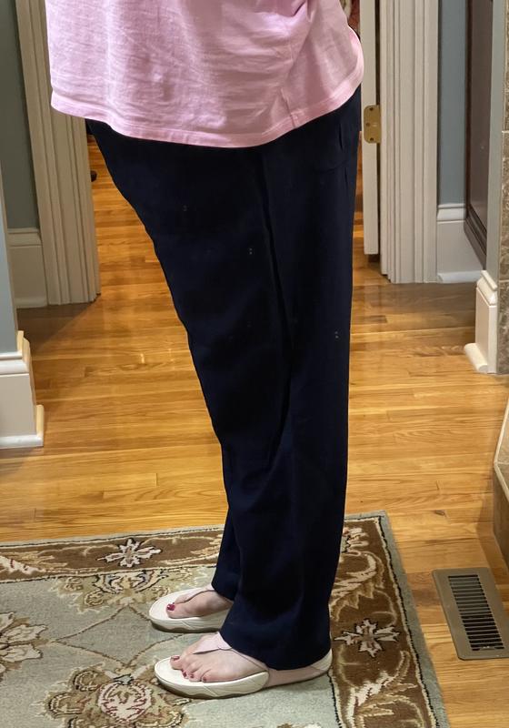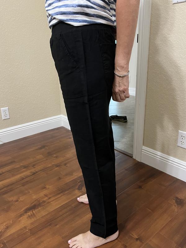 Great travel pants. Super comfy and stretchy material. Could wear for long flights. The length is perfect and love the elastic waistband without the strings. Dress it up or down as you like
