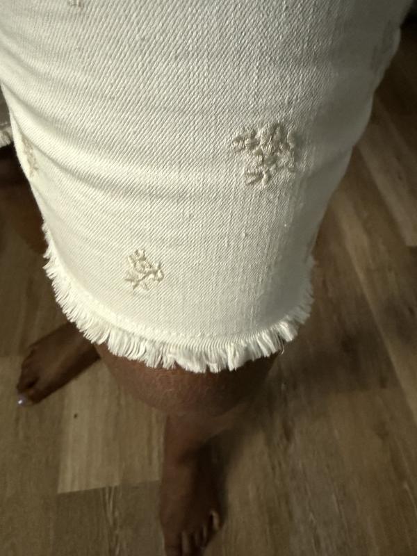 Great fitting longer jeans shorts; mid-weight, and wash well (no shrinking)! Bought a size 10 & 12 and found size 10 is perfect (no saggy middle)! Also tried the small flower pattern & it’s cute!