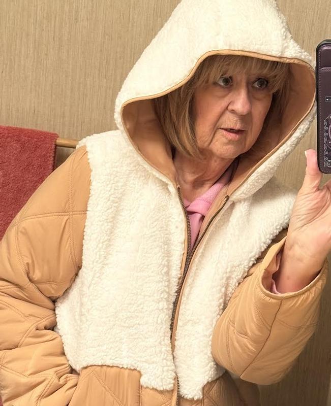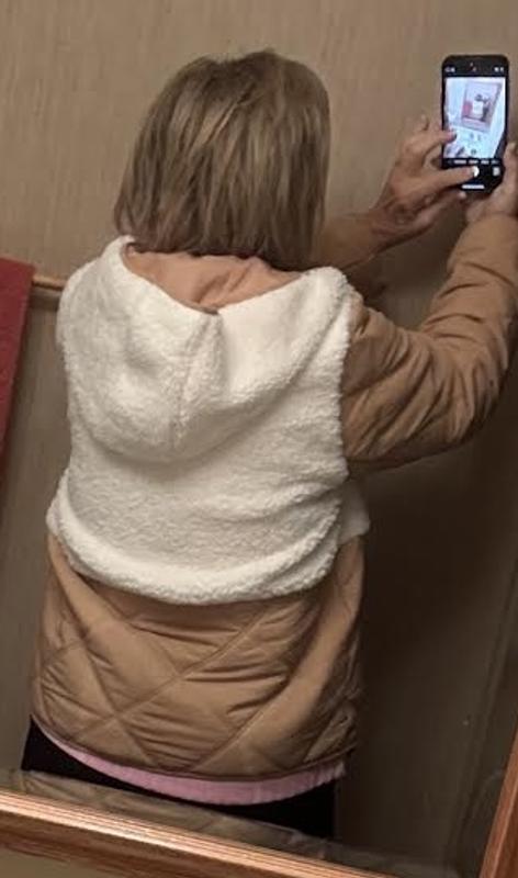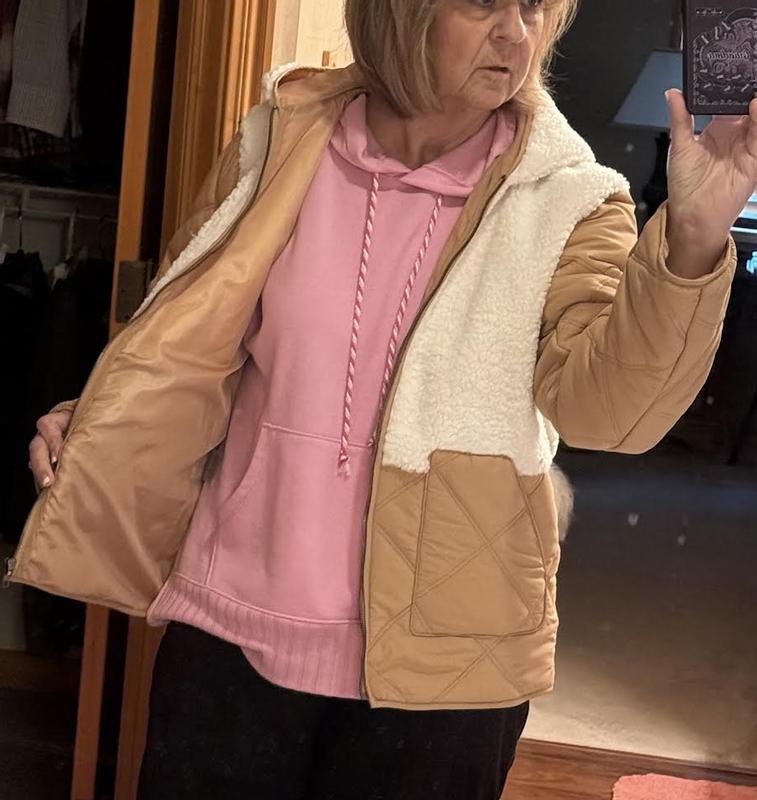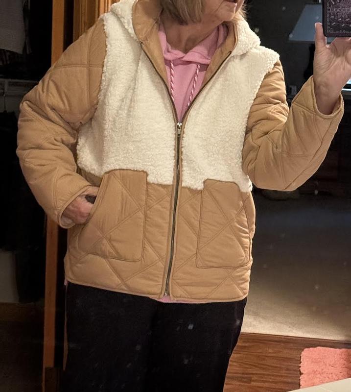 I love this jacket and have gotten many compliments on it! The cream color Sherpa accents the camel color of the jacket well and goes with anything you’d wear! I’m 5’4” and wear a M in all Style & Co clothing, and this jacket is roomy enough to wear over my sweatshirt. The length hits me at the thigh. Completing this jacket are the side pockets and the generous hood to block the wind.