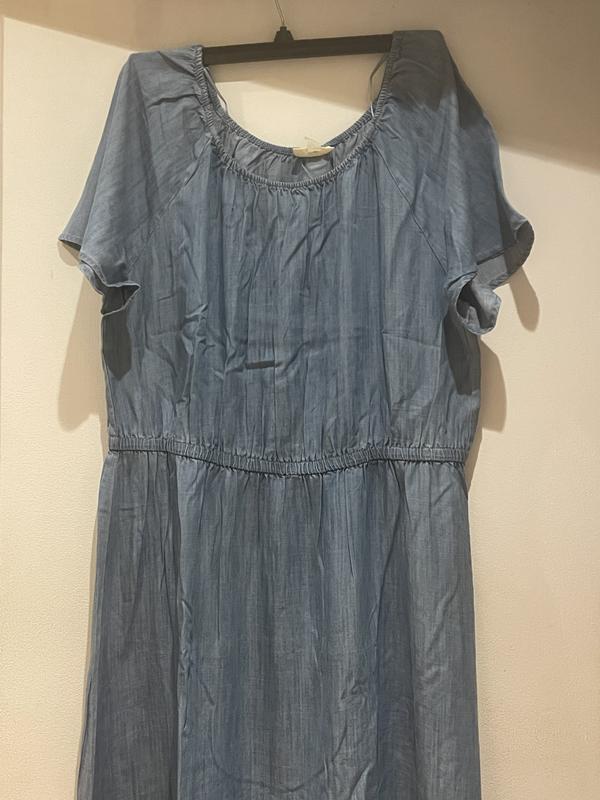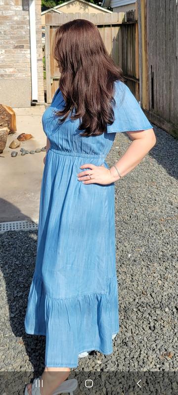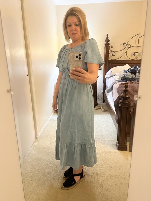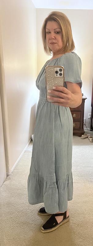I’m 5ft. 2. Hits me at right above ankle as a maxi. Washed well, hung to dry. Needs a bit of ironing or a spray of water and a dryer spin to bounce back. Sexy shoulder/scoop neck. Great fit on a pear body. Tons of compliments at work on this dress. So versatile that I will take on a future vacation-chambray keeps it casual but tiers and off shoulder dress it up. I hope it lasts forever!