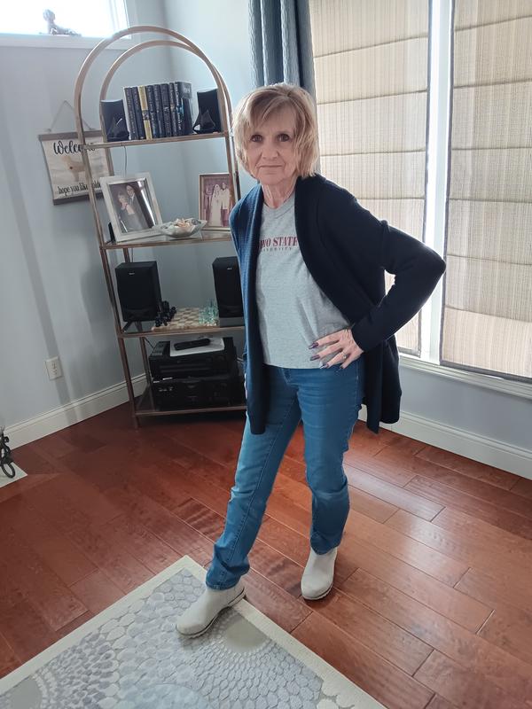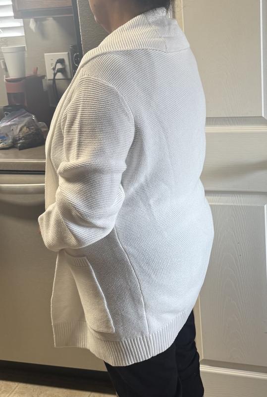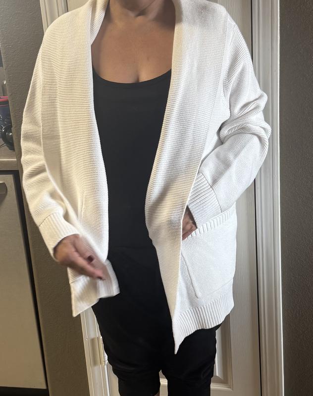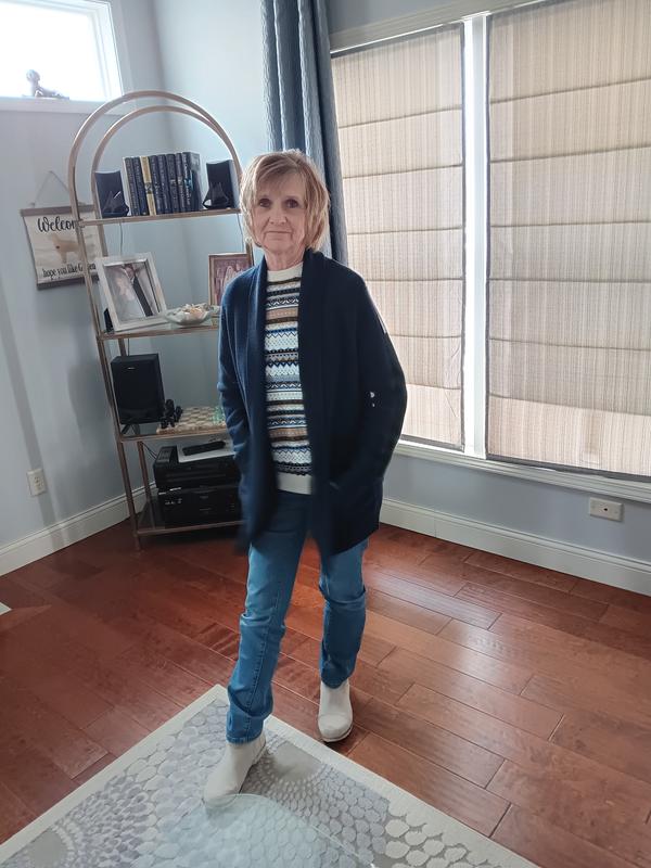 This is the softest and coziest cardigan I own. I’m petite (four ft, 11 in) and could have gone down a size (ordered medium) but the length still works and is comfortable, while wearing flats or heels. I’ve machine washed and dried as instructed several times without issue. Looks great with jeans, leggings, and slacks. I have dressed it up and down. It’s not thin by any means, and offers a good layer of warmth without needing an additional jacket. It’s become one of my favorite pieces.