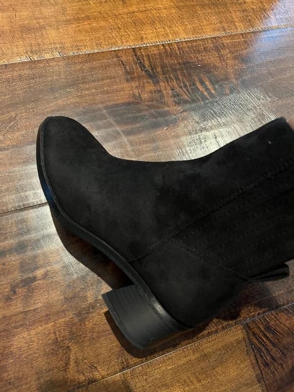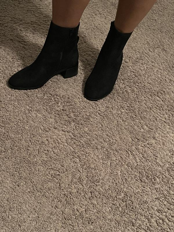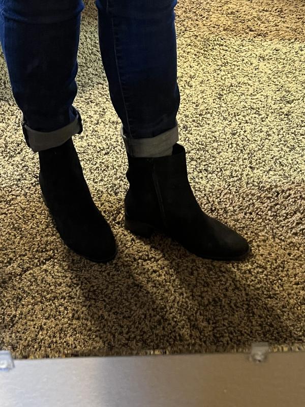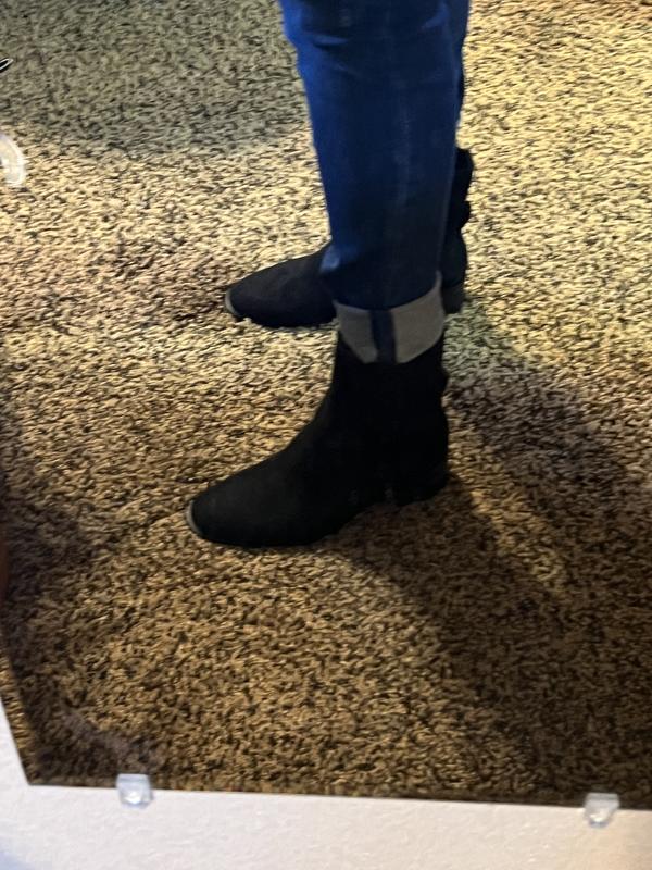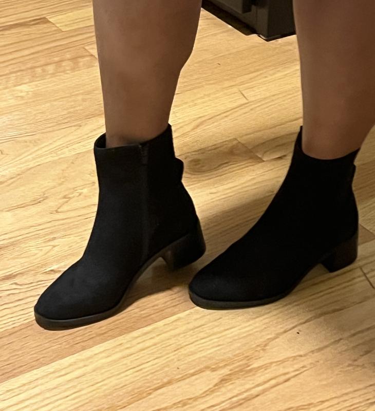I order this boot in black. The finish of the boot gives it a flat velvety look. I also picked this boot because of the sole. A lot of boots feel like you're walking around the ground. This boot has a nice sole that I dont feel the ground. I have ankle problems. This boot was very supportive. And the slim line look will dress up your jeans, if you want a little more dress look.. They was true the size and width. And yes, I would recommend this boot