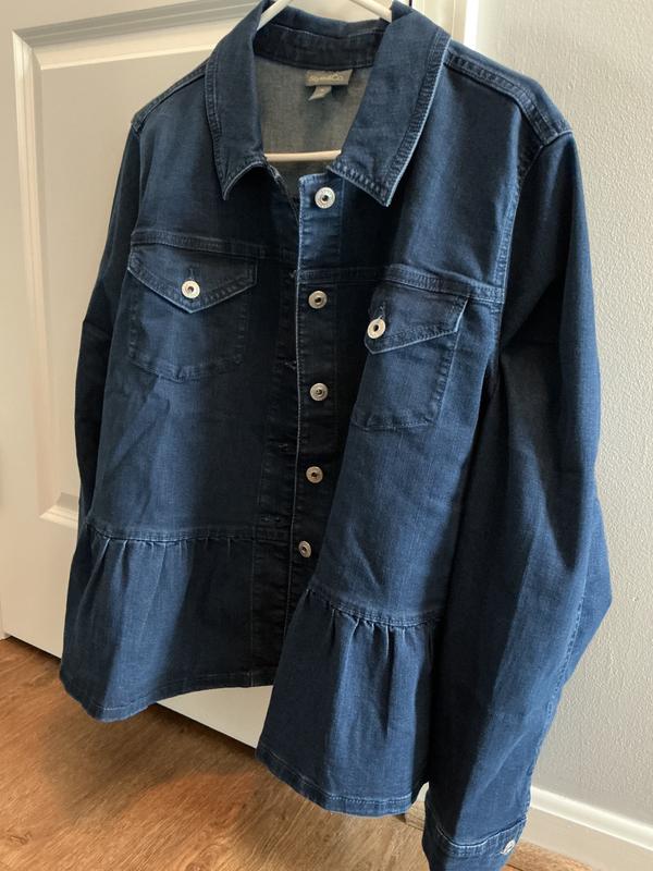 This is the first jean jacket I’ve ever liked. The ruffle on the bottom makes it very feminine. The cuffs on the sleeves are minimal and not at all bulky like traditional jean jackets. It’s also a very stretchy fabric that makes it super comfortable to wear. I wish it came in multiple colors. It fits very true to size.