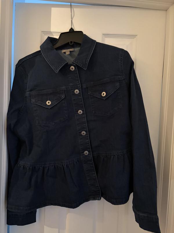 This is a very stylish and comfortable jacket. Perfect for layering and great for the spring or to wear on the summer evenings. The material has a lot of stretch to is making it easier to move around in than most traditional denim jackets. The peplum style makes this jacket very feminine and different from other styles.