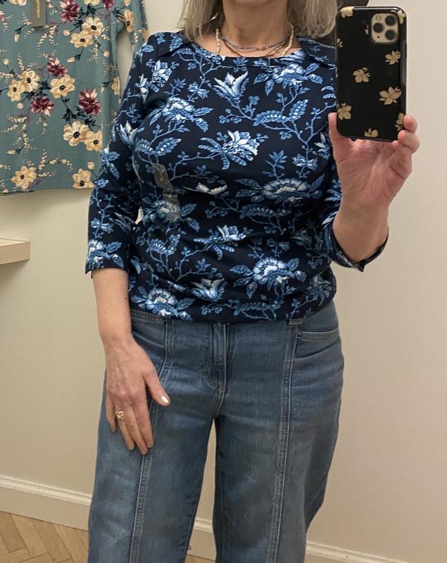 This cotton top is soft and comfortable. A very flattering fit. The colors allow you to wear with jeans to make a terrific outfit. I will buy more.