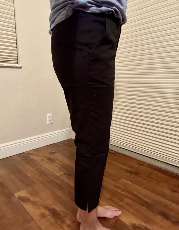When wearing, pants feel like they are on backwards. Not comfortable and hard to walk in them.