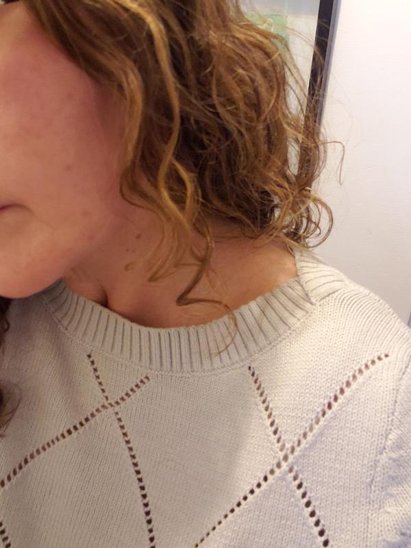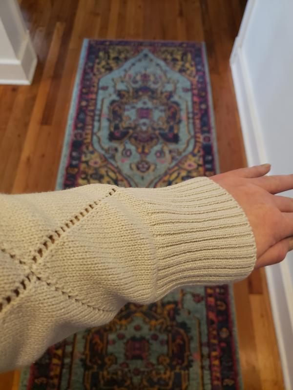 This sweater has an interesting pattern and is cotton which is hard to find. Wearing a coloured cami underneath such as pink under the cream or light grey would give this sweater a wow look. Sizing is very generous, size down.