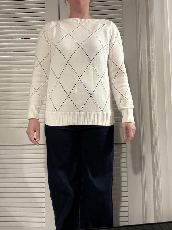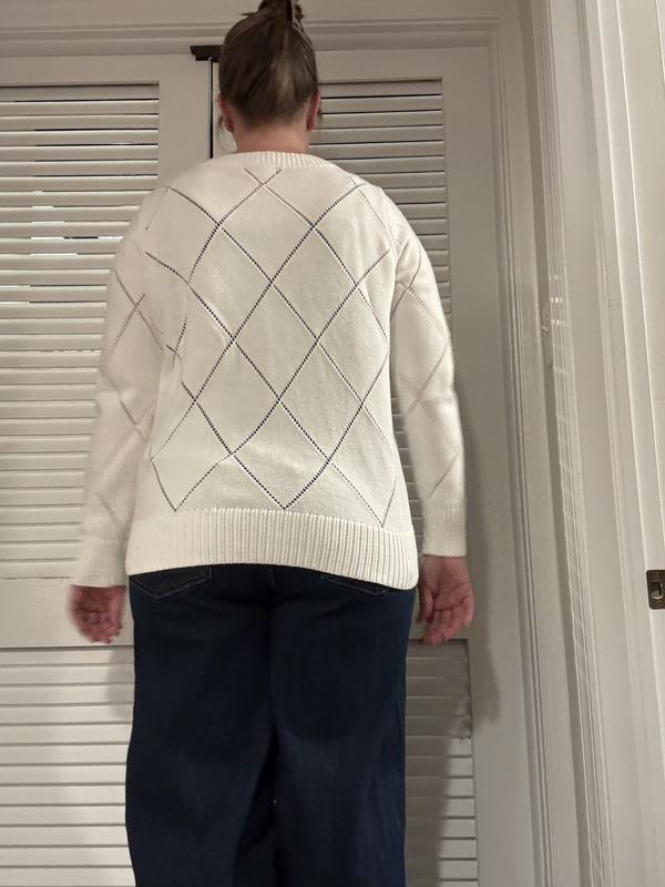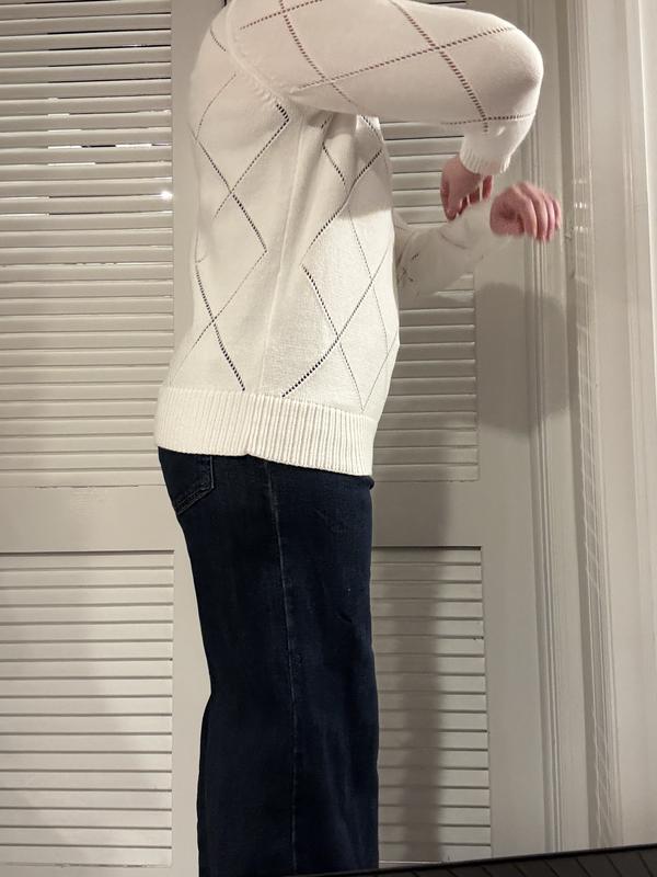 This Style and Co sweater is well made, but unfortunately is not flattering at all. I think it is an awkward in-between length. It’s too long and shows the buttons on your jeans and is awkward to roll up to avoid that. But, the sweater is too short to wear with leggings. Due to the holes in the sweater, you have to wear at least a tank top underneath. I think this sweater weight would be nice for springtime weather where it’s still a bit chilly but you don’t need a heavy weight sweater to stay warm.