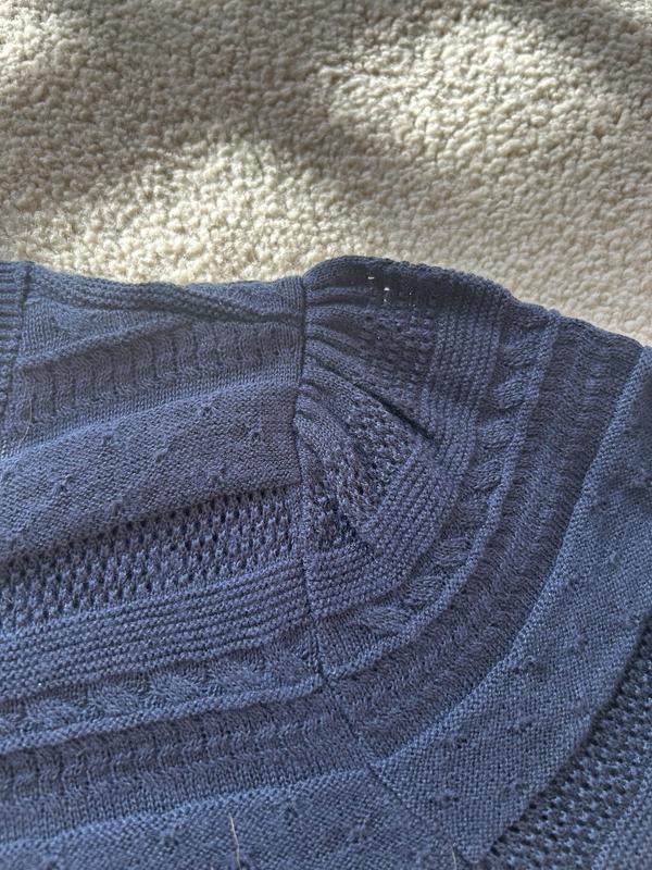 This is a more fitted type sweater. It falls to the high hip. The pointelle knit is pretty and sheer. The shoulders have some gathering of material at the top.