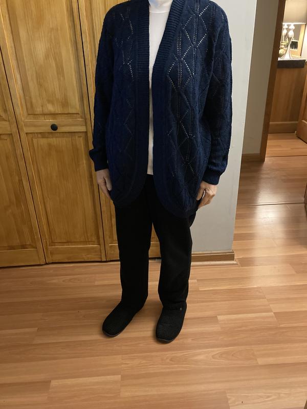 Very beautiful and comfortable sweater. The only negative would be it runs very large! I thought I needed a large and ended up with a Small, and it's still roomy.