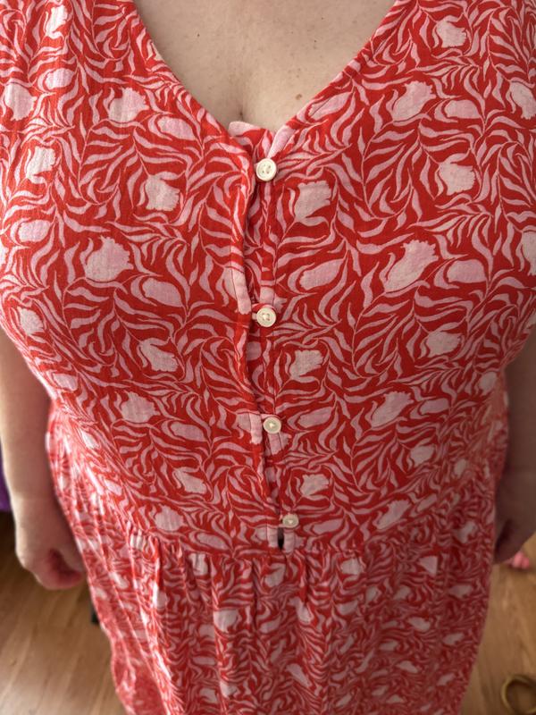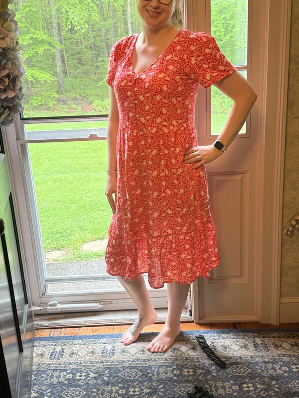 Very happy with the dress. I bought a size smaller because the reviews said it runs large, and it does. Washes and goes in the dryer with no shrinkage. Perfect dress for summer.