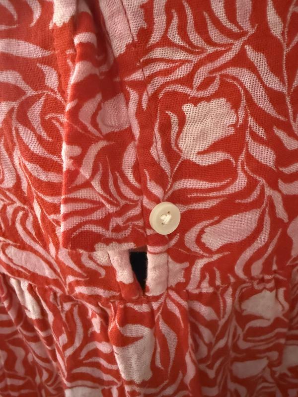 Cute dress but runs large. Ordered a medium and washed it thinking it would shrink because it is cotton. No shrinkage so I'm now going to stitch the sides down to the pocket to fit me. If I had known it wouldn't shrink, I would have returned and ordered a size small.