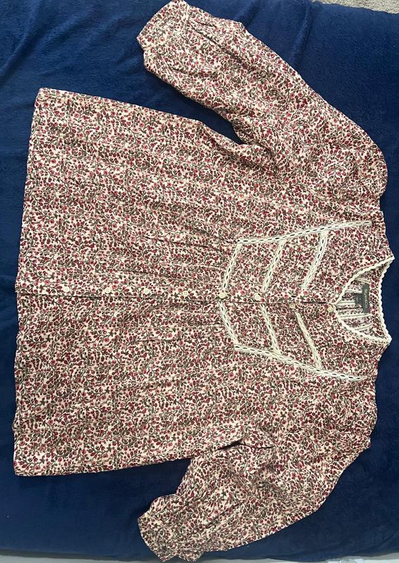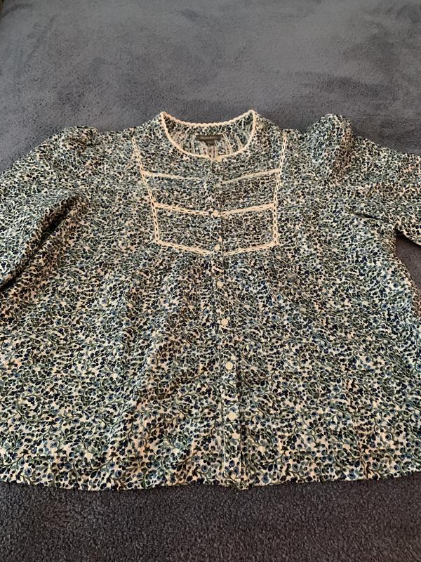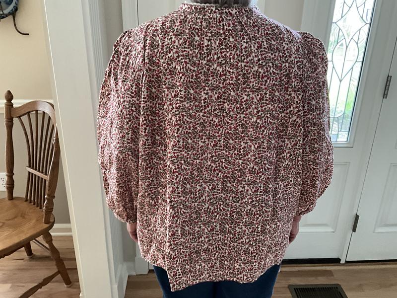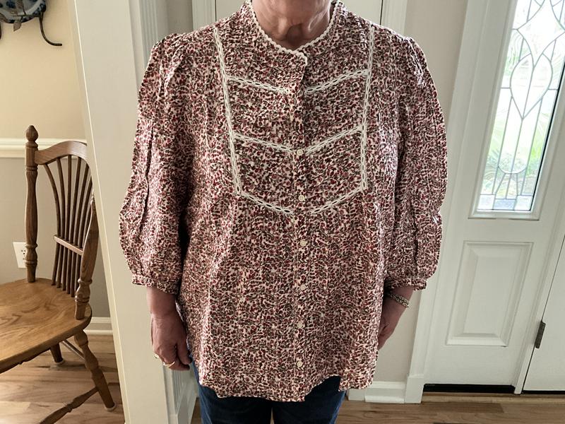 I loved this beautiful blue and green pattern. It is very feminine with lace trim on the yoke. The fit is very loose with very big sleeves. It is flattering if you have a few extra pounds or large arms. I am 5’2 size 10 and a medium fit loose. The 3/4 sleeves fit almost to my wrist, but I have short arms. On my friend they were 3/4 length. I didn’t like the lace on the yoke as it felt too prairie for me, but a friend of mine just loved the shirt, so I gifted it to her.