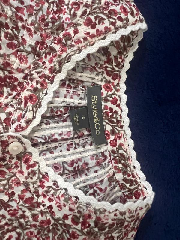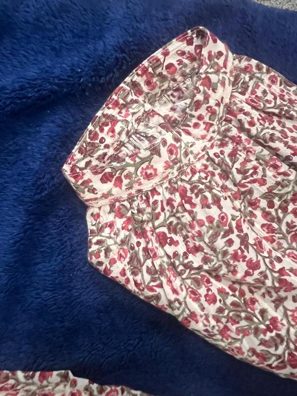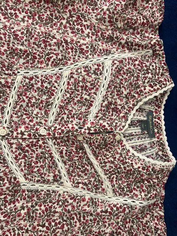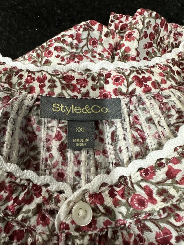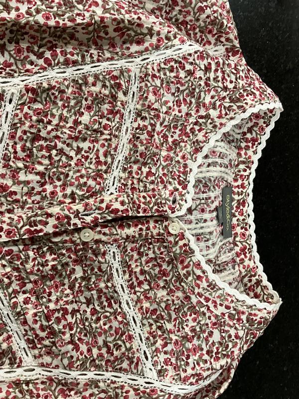 This is a very pretty top. It’s comfortable and I think it is true to size. It is 100% cotton, made in India. The finishing on this top is very nice. It has sewn in bands at the end of the sleeves instead of just elastic and a nice lace design in front and around the neckline. It’s a medium weight cotton top in a pretty pattern reds, green and cream colors. Definitely a keeper.