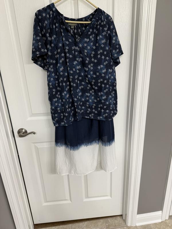 I like the loose, flowy fit of this top. It can be used for every day or as a slightly dressier outing. Love this color blue.