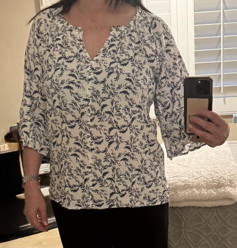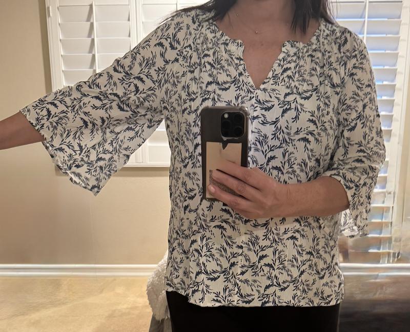 Comfortable loose fit through the body. Cute fabric pattern. Flattering neckline. I do not care for the flowy bell sleeves. I think it would be cuter with just a short sleeve. Nice to wear with jeans .