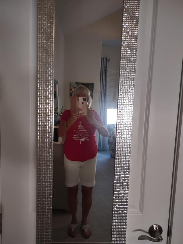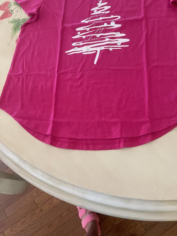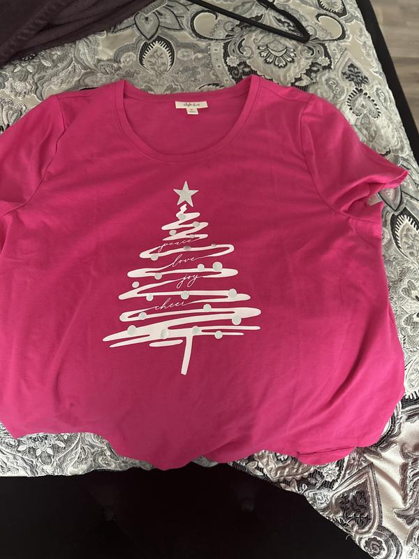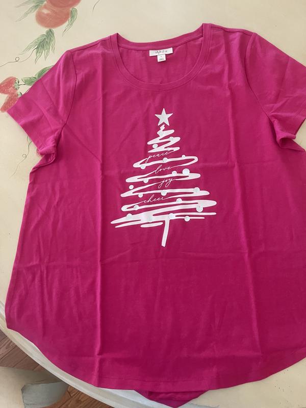 I bought this in the pink with the white tree. I love it. The material is nice. This would also look cute under certain jackets of mine. This brand never used to fit me well - lots of the tops were to narrow and long. This one fits very well - it’s not narrow. I wanted a short sleeve top to wear in the house when having people over. I just love that it’s a bright pink.