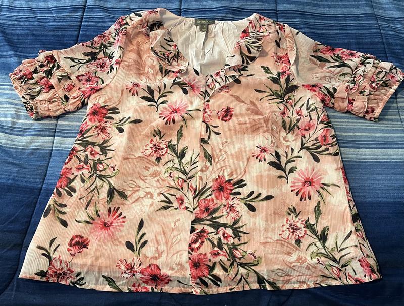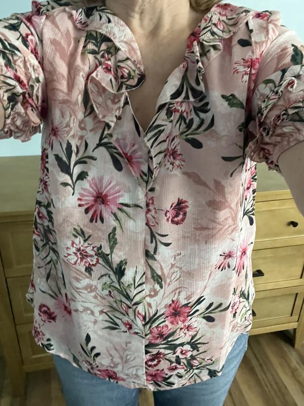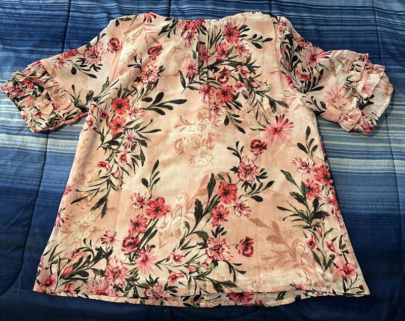This top is like spring to summer top with nice floral print and ruffle patterns. Looks great on jeans or capri leggings. Fabric is light and it comes with lining. Length of the top is perfect up to hips