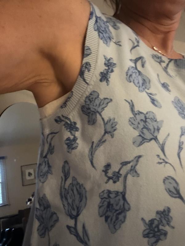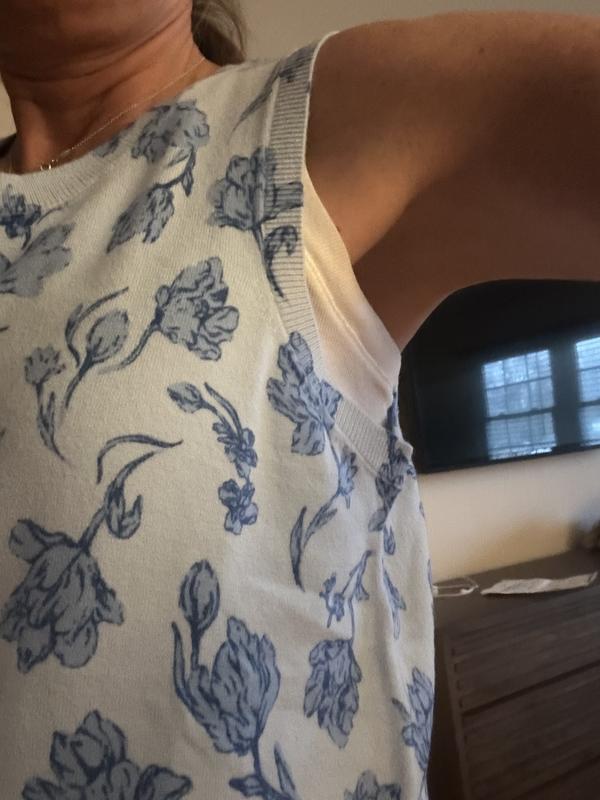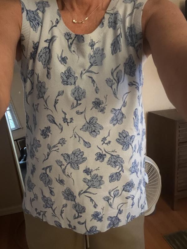 This sweater tank is very soft and I love the bold color, and pattern. It does run in my opinion quite Large, especially in the armpit area. It is not a bad thing, but also was longer than I anticipated.