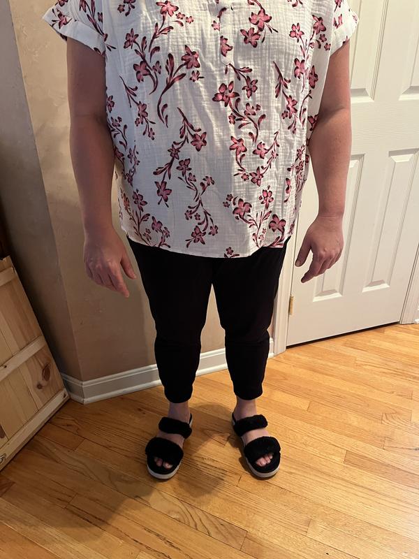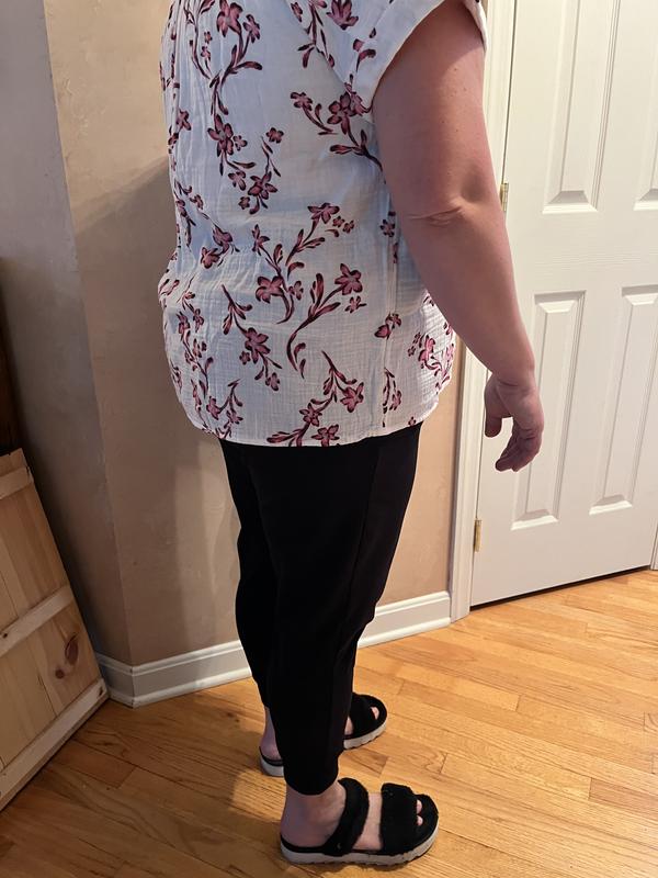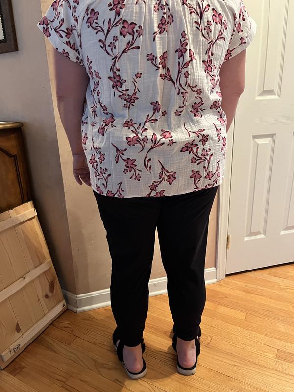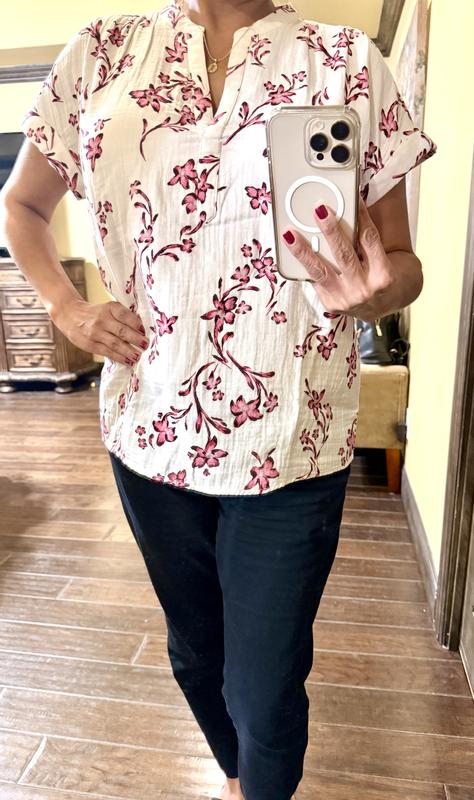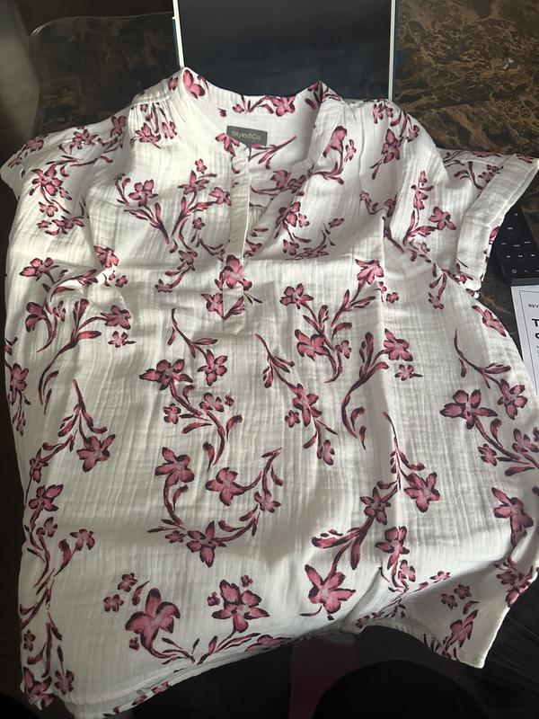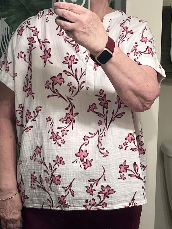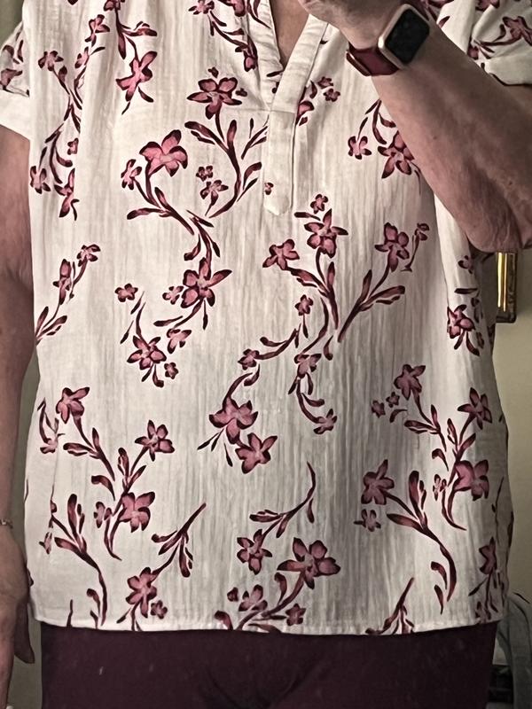 I like the floral print and the fact that it is all cotton. Very comfortable to wear with a somewhat looser, boxy fit. The top washed up well and didn't appear to shrink when put in the dryer. There is a somewhat gauzy texture to the fabric which I like.