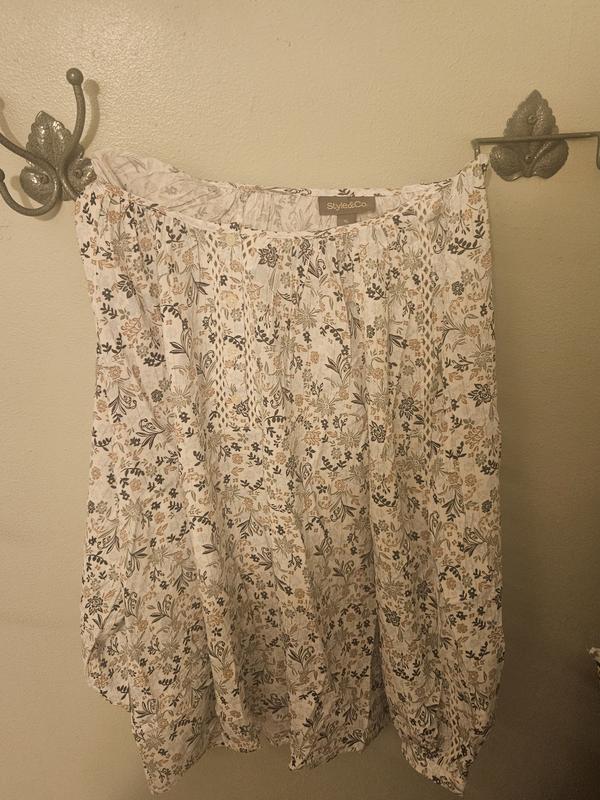 I like this peasant style top. This top is can be worn in spring summer or fall. Very nice material well made. The pattern is little flower and leaves with a little sparkle of silver. dress up or down.