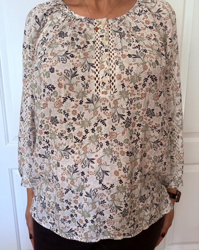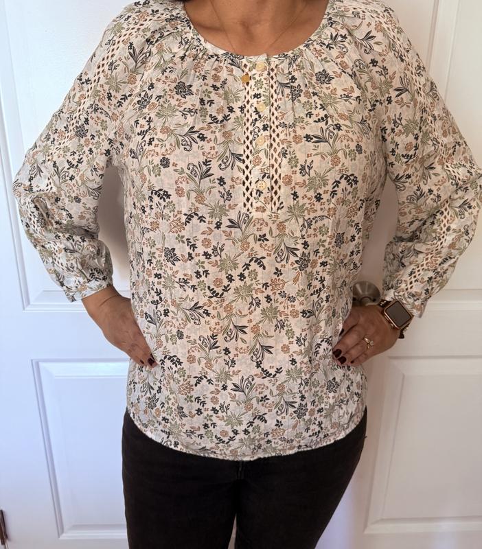 I like this peasant style top. This top is can be worn in spring summer or fall. Very nice material well made. The pattern is little flower and leaves with a little sparkle of silver. dress up or down.