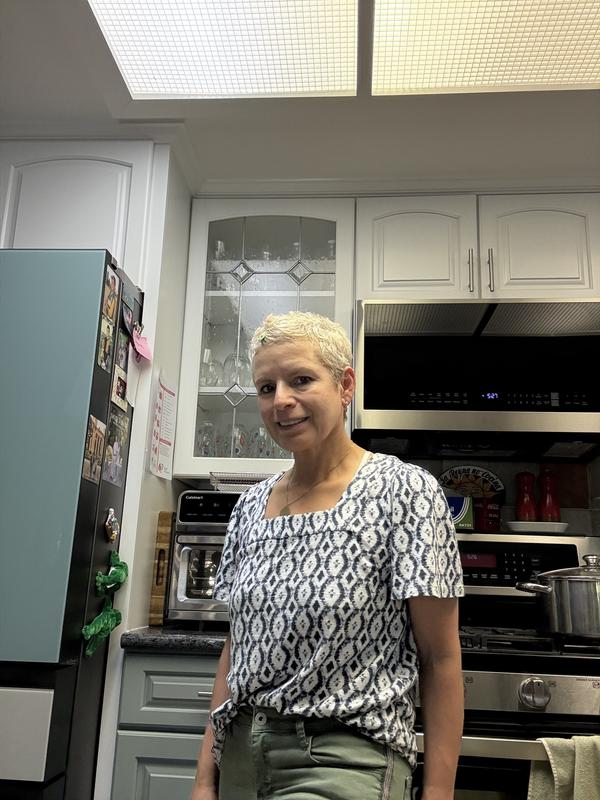 Style and Co small print square neck top with flutter sleeves is lightweight and fits true to size. The top hits mid hip which may not be desirable for someone with larger hips. It could be tucked in for a different look. The addition of the flutter sleeves adds a summer look and the square neckline is complimentary. I’m not fond of the print as it does not appear youthful. I would style it with a jacket.