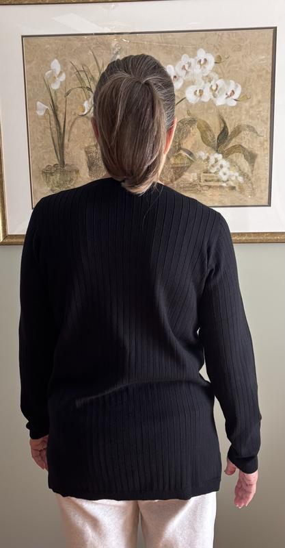 A great lightweight sweater. It has shape without being tight or fitted. It is comfortable and a perfect length; not too long that it looks frumpy. Very versatile.