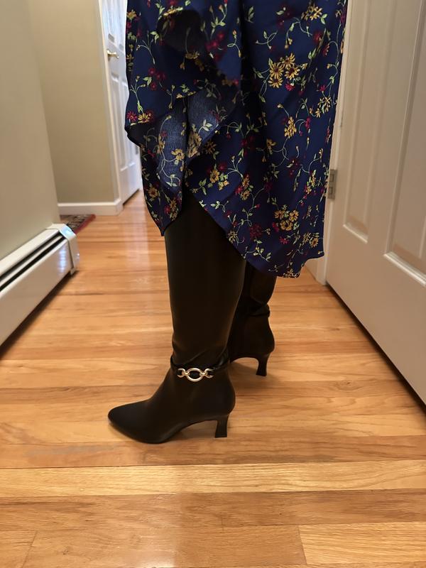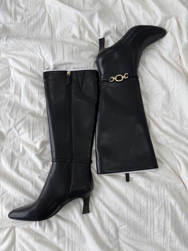 These boots are stylish, comfortable, and the perfect heel height. The gold chain accent adds just the right amount of dressiness when I want to elevate my outfit. I wore them out wine tasting with the girls with a baseball cap adds a casual edge, so you can dress the boots up or down easily. The calves are a little roomy, but I have smaller calves, so that’s common for me in most boots. Overall, I absolutely love these boots.