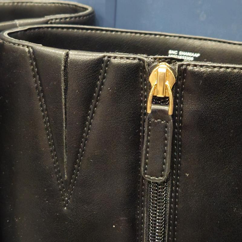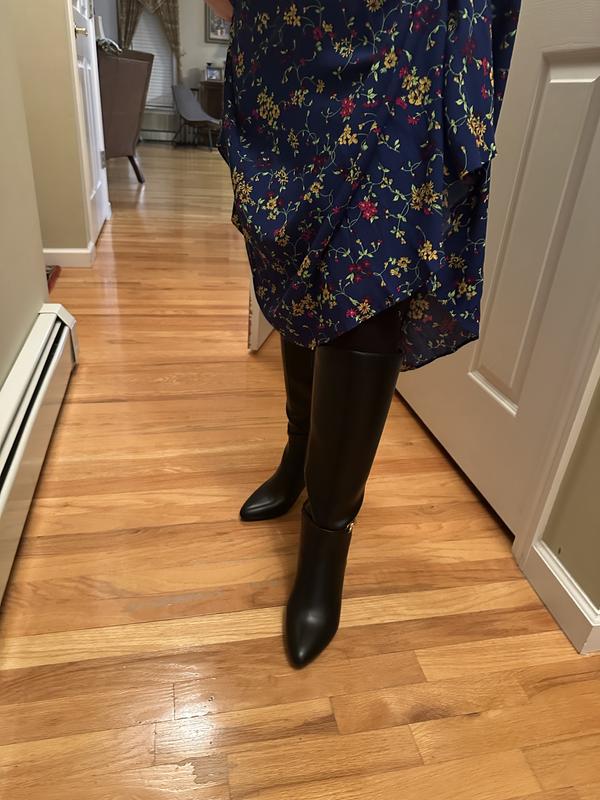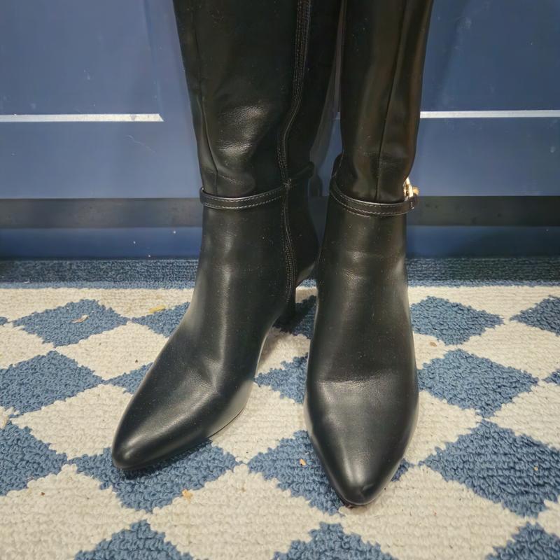 This is a beautiful tall dress boot. It has a pointed toe and two inch Stiletto like heel. It is man made material and has a classy gold embellishment towards the ankle. The boot is very comfortable. It feels as though the boot has a cushion insole and is true to size. I have average size calf’s and it fits perfectly. The style of the boot would appear as if the heel should have been taller especially with the stiletto type shape. This boot is definitely appropriate for dresses, skirts and even slacks.