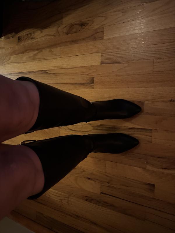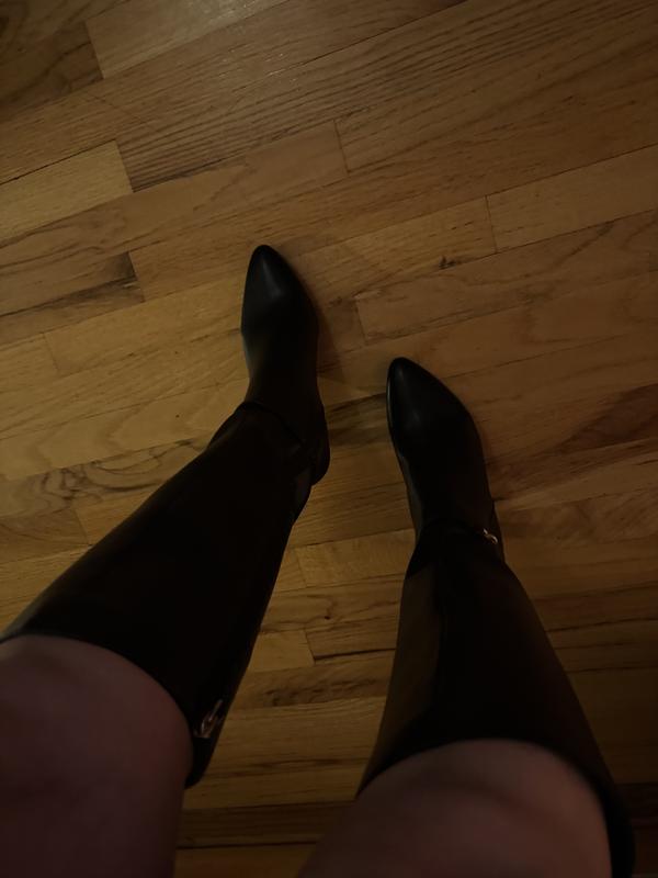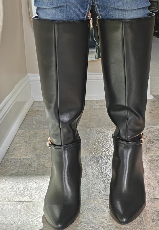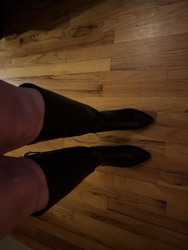 Love these Boots. They fit right in between knees and calves so it doesn't push behind your legs while sitting. Love the built in stretch for larger calves without being too wide. Heels are stylish, yet very comfortable Zipper is good quality and the gold accents are subtle not cheap or gaudy. Love these Boots