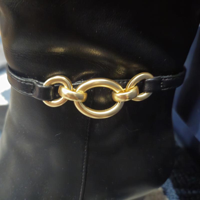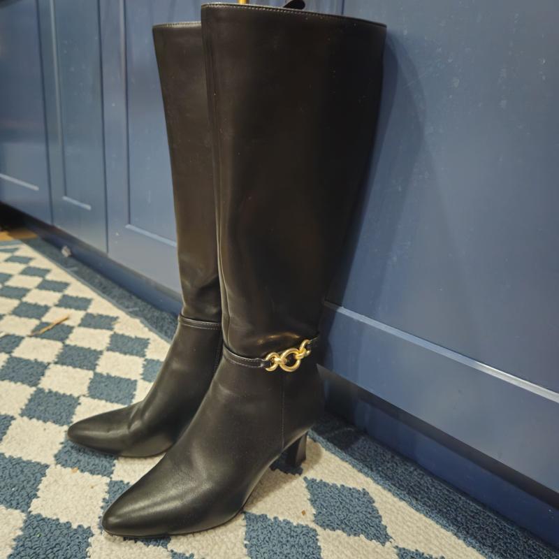 Black Heeled Boots with Gold Accent great for any occasion. Elegant almond shaped black low heeled knee high boots. Features gold chain detail. Perfect for a cold day out or even paired with your professional work attire.