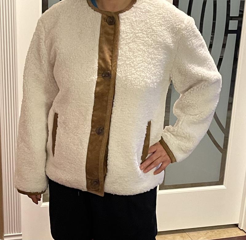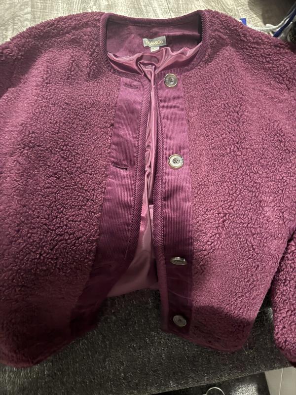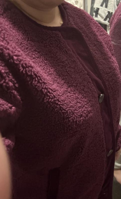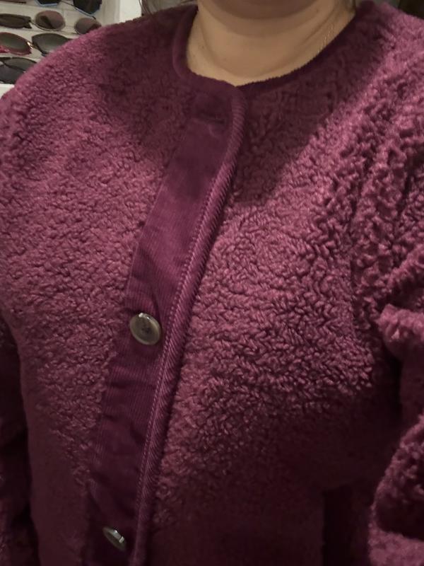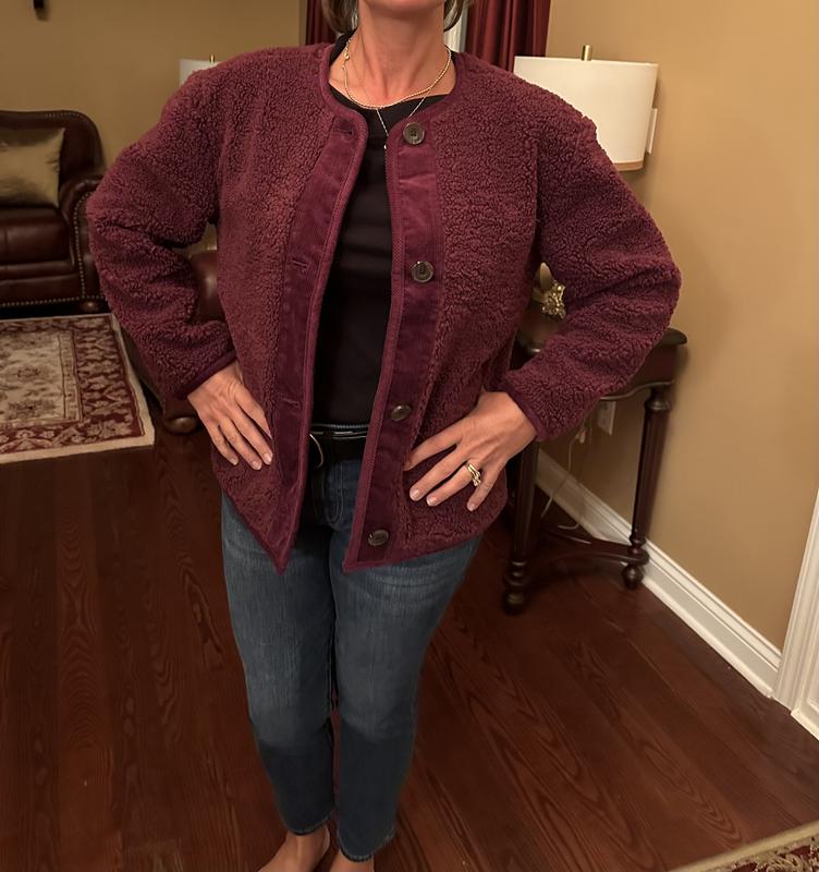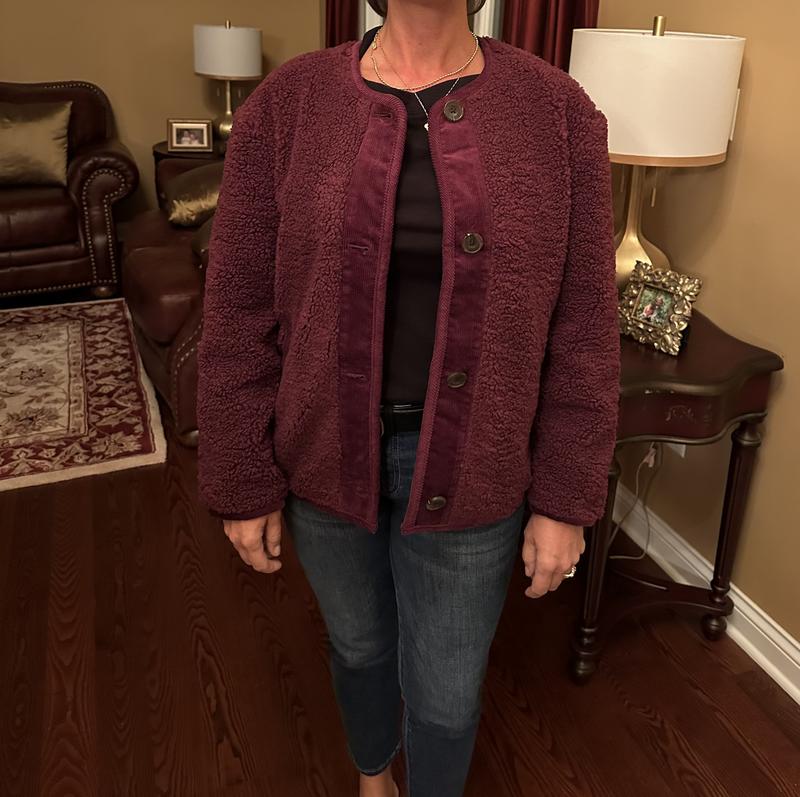 This button-front Sherpa is so cozy! I love the corduroy detail where the buttons are trim of the jacket are. Such cute and trendy detailing! I am 5’5 130lbs and ordered the XS. I’d say it has a slightly oversized fit which is perfect for this style. I was able to pair it with leggings and a light sweater underneath. I’m wearing the deep cranberry color. It has a more purple hue! Great find!