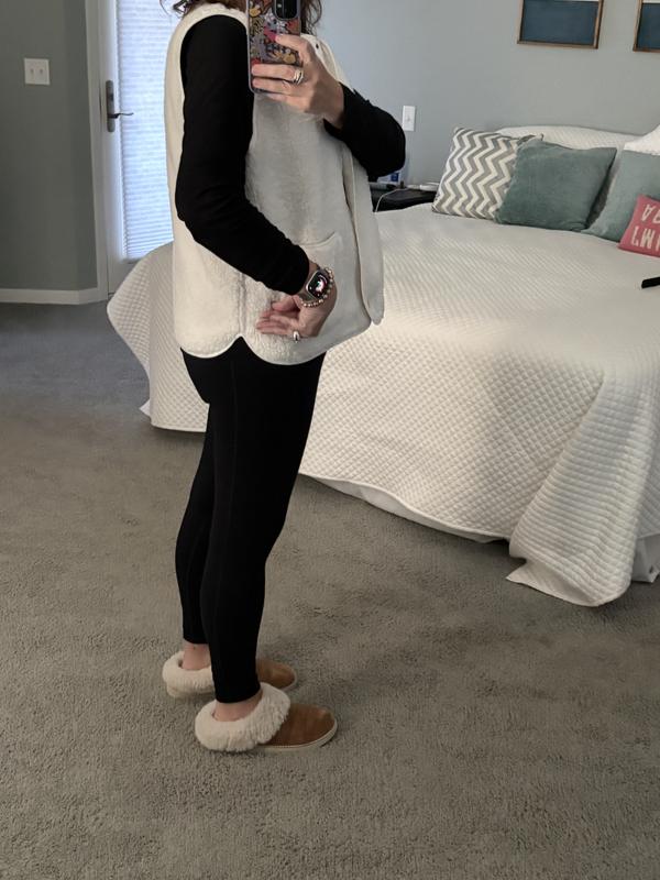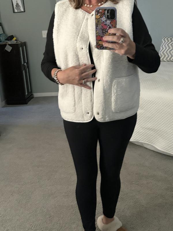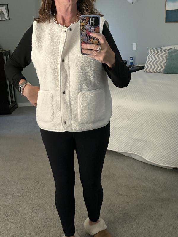 This vest is different from any others I have because is it a low profile and shorter waisted. I like that it has snaps and not a zipper. I often leave it open but when I’m chilly, I just snap it up. The creamy white color is great and it is lightweight thin sherpa fleece, which is nice and versatile. The arm holes are just right to be able to wear anything you want underneath. I usually wear a small or medium, but extra small was the only one available and I took a chance. As you can see it looks great. I think they run a little roomy.