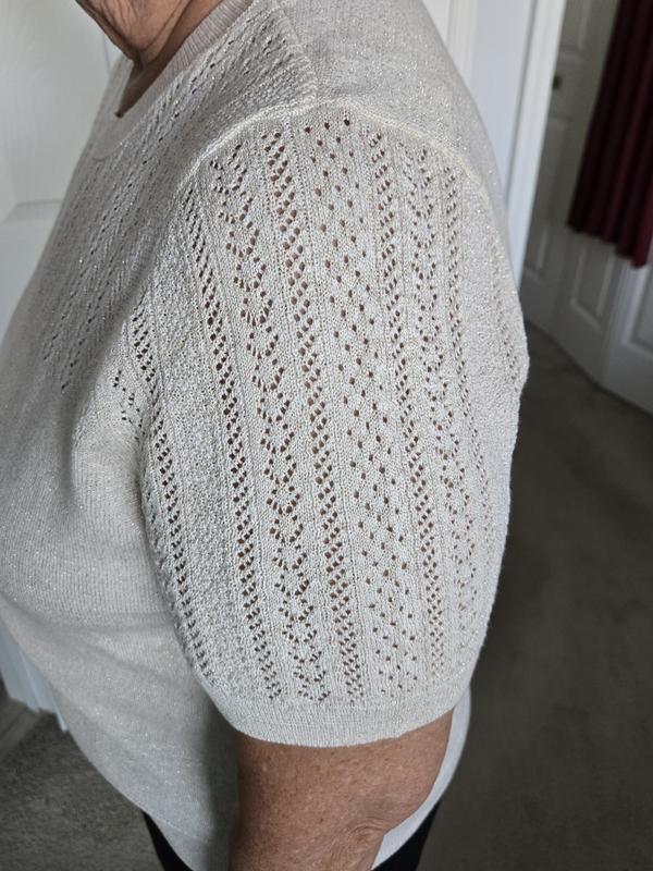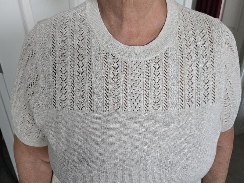 Made of soft cotton blend knit; 47% cotton, 39% acrylic, 9% polyester, 5% other. The sweater is lightweight - making it ideal for everyday wear. Crew neck with pointelle yoke and flecks of gold thread. I normally wear a medium but went with a large as I don't like fitted tops and I think the large fits well. It is very comfortable and can be worn dressed up or just everyday wear.