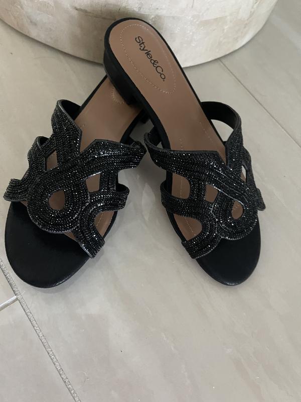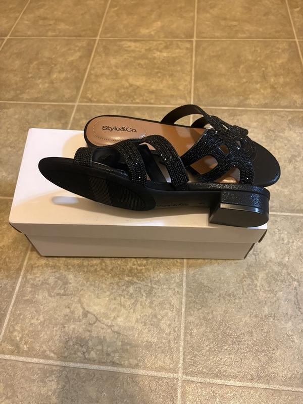 These sandals will work well when I want to dress up an outfit. They have a sparkly pop to them. I like the low heel as I’m done with maneuvering in high heels. I wear a size 9 and these fit perfectly. I would like to point out they’re not wide which has the advantage of not sliding off cause with a normal width foot they are snug, not too tight. I think someone with a wide foot would find them uncomfortable.